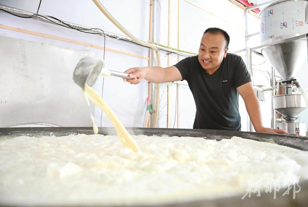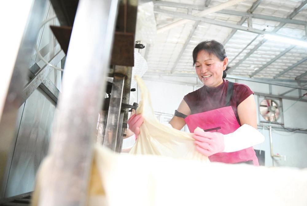 6月18日,魏延霞正在豆腐坊内压制豆腐。