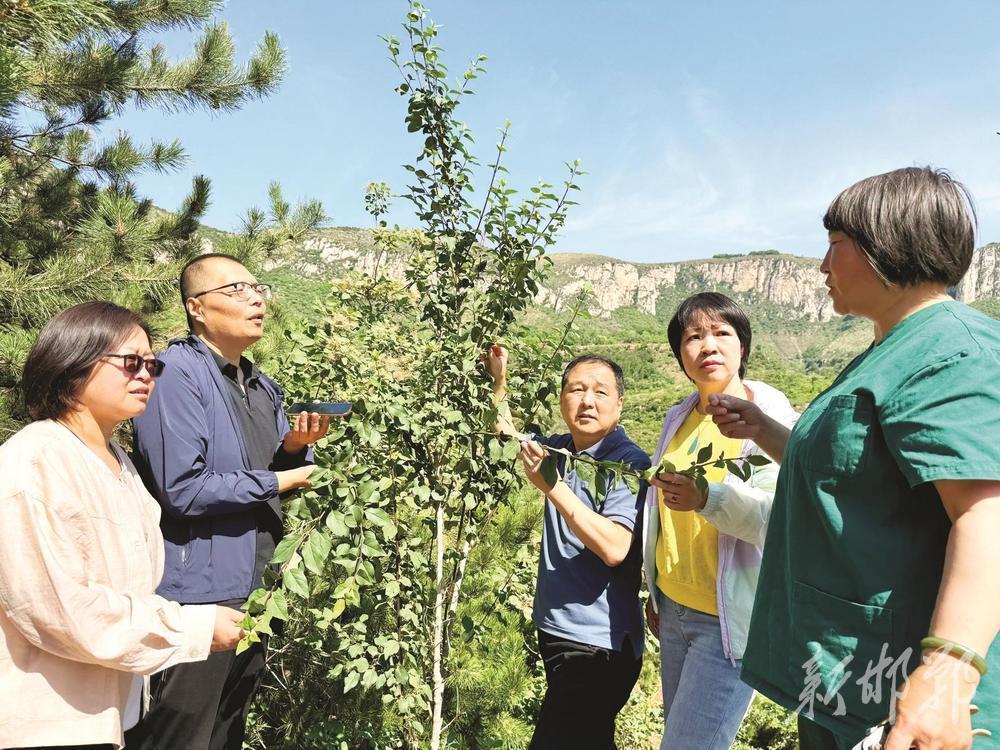 6月18日,在宅清沟连翘基地,闫玉莲(右一)为记者详细介绍连翘的功效。