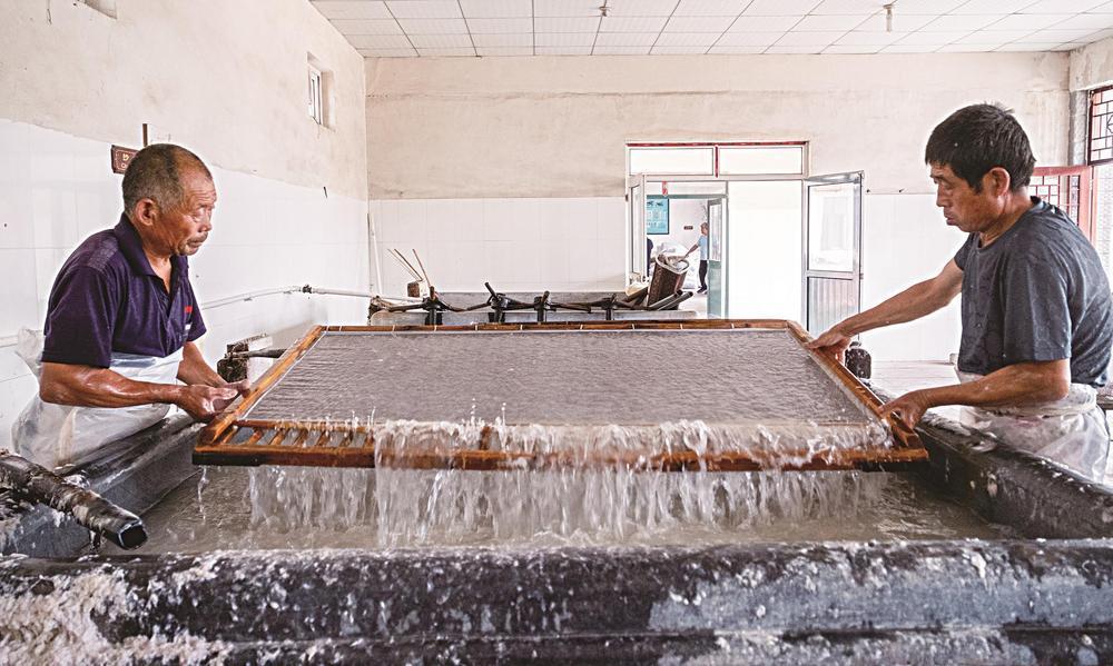 正抄、帮抄师傅腰系围裙,端起纸帘,竖直往下,回拉纸帘,纸浆均匀在纸帘表面流走……近日,享誉盛名的迁安手工桑皮纸在迁纸文化艺术产业园区浴“爱”重生。