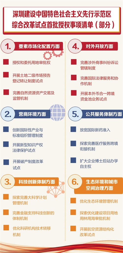 2019年8月18日,《中共中央国务院关于支持深圳建设中国特色社会主义先行示范区的意见》发布。《意见》明确提出:“在中央改革顶层设计和战略部署下,支持深圳实施综合授权改革试点,以清单式批量申请授权方式,在要素市场化配置、营商环境建设、城市空间统筹利用等重点领域深化改革、先行先试。”