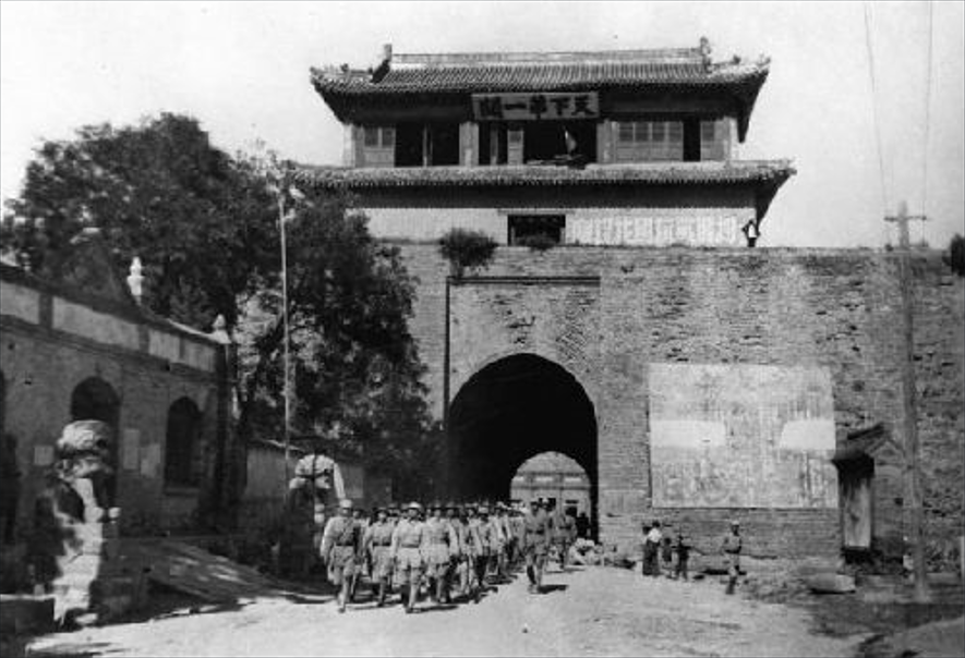 1945年8月30日,八路军收复山海关后列队通过城楼。图源参考消息网