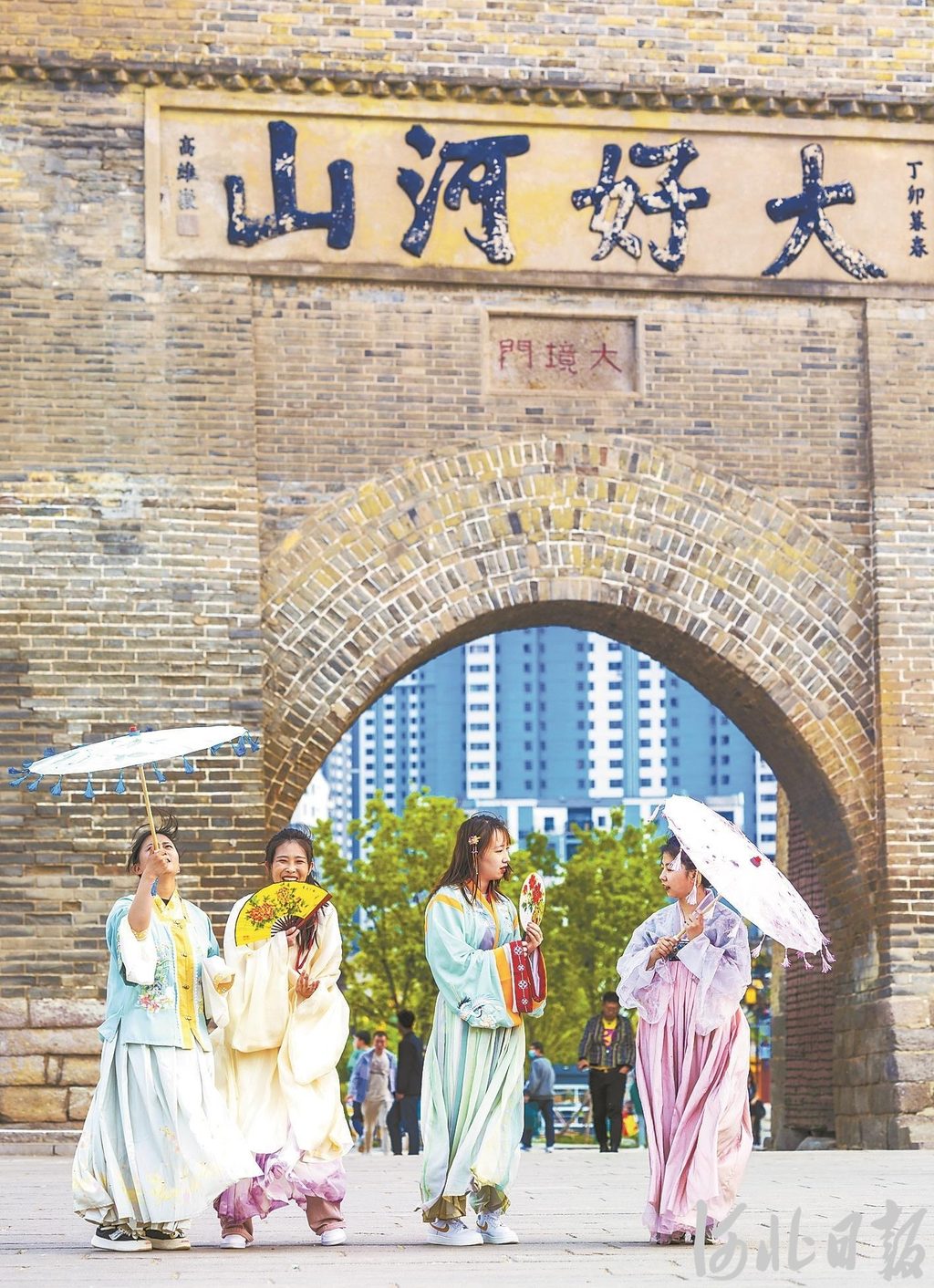 身穿汉服的游客在张家口大境门景区游览。河北日报资料片