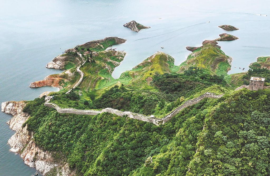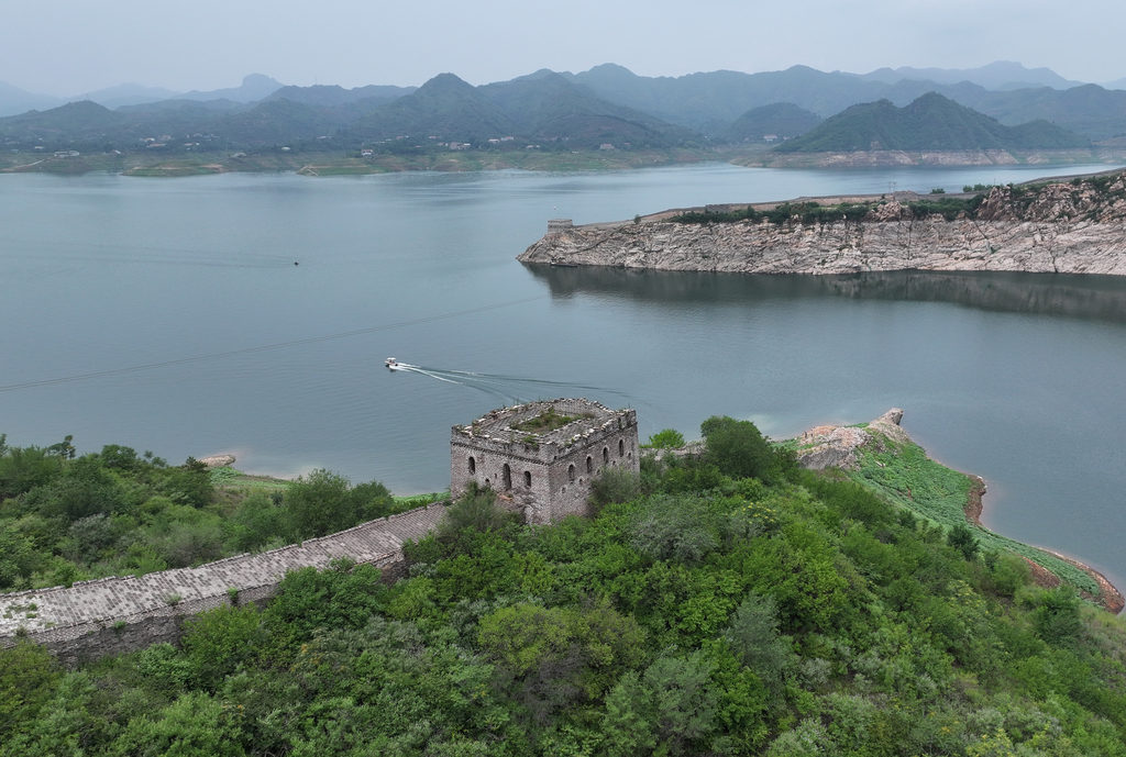 7月13日,在潘家口水库拍摄的露出水面的长城(无人机照片)。新华社资料片