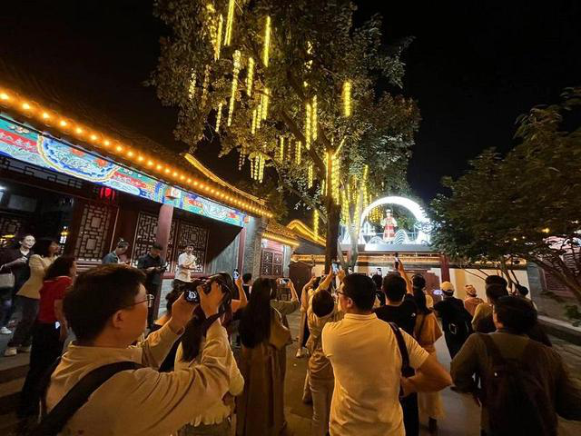 当天活动的第三点位,媒体走访团一同体验荣国府“一梦入红楼”夜游项目。初次进入夜晚的荣国府,便感受到与白日不一样的景色,随着脚步的深入,眼前的景象逐渐变得梦幻。院内建筑在光影效果的加持下更显雅致,影像与灯光变化间,流露着红楼美学。花灯如繁星般,将夜色中的荣国府装点成古典与现代的结合体,仿佛步入了一个古今穿梭的独立天地。“这块特适合出片”“好美的光影”……在游览中,大家通过镜头去发现荣国府的夜景之美。