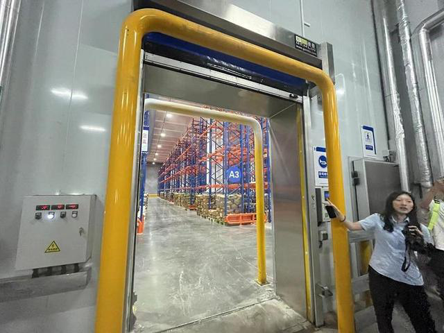 仓库前,各种冷链运输车不停地进出园区,将各种肉类、海鲜类、速冻食品类、果品类等冷冻货品在这里流转。近距离,偌大的冷链物流仓库,看不出一丝冷意,然而随着讲解员将冷库的闸门一开,一股寒气扑面而来,冰雾状的空气从冷库内冒出,为了拍摄冷链仓库镜头,大家进入仓库内部,短短的数个镜头后,便从匆匆而出。“感觉冬天到了”“里面嘎嘎爽”……在镜头中,仓库内部是一片井然有序、科技感十足的冷藏天地,高耸的货架伫立在全温区全自动化冷库内。据介绍,冷库采用先进的智能化管理系统,温度精准控制在零下18度至零下25度之间,日常监测的平均温度更是稳定在零下21度左右。在工作人员的引导下,大家注意到他手中握着的PDA(掌上电脑)设备。这个看似不起眼的“小家伙”,实则功能强大,它实现了商品从收货、上架、出货到运行轨迹监测的全链条智能化管理,极大地提高了工作效率,减少了人工成本的投入。