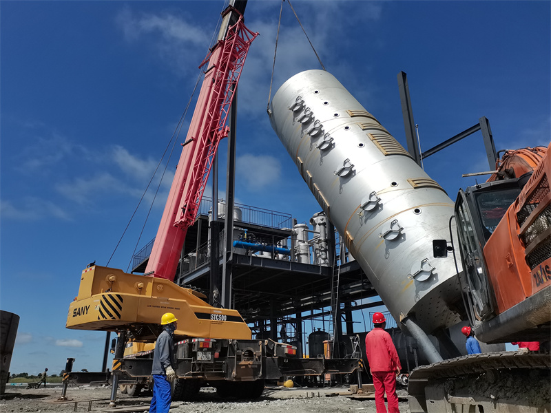 2023年,晨光生物赞比亚农业发展有限公司的提取生产线建设施工现场,工人正在吊装蒸脱机。