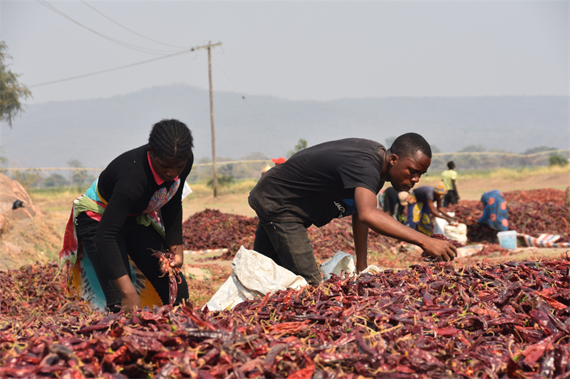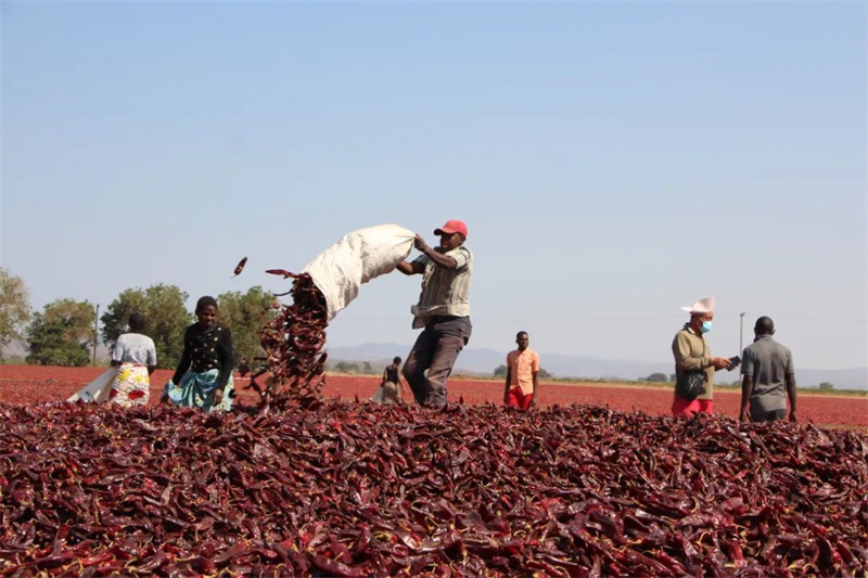 2023年10月,距离赞比亚首都卢萨卡350多公里的晨光生物赞比亚锡纳宗圭农场正值辣椒收获季。蓝天白云映衬下,当地员工和中国员工有说有笑忙着采摘,小辣椒映“红”了他们的笑脸。