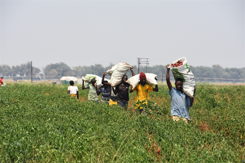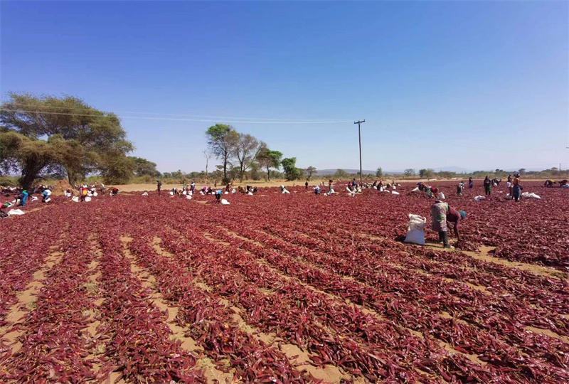 2023年10月,赞比亚当地员工忙碌着收获辣椒。