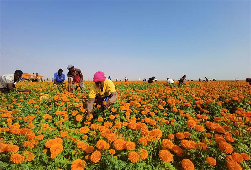 2023年7月,当地员工忙碌着对新一季的万寿菊花进行采摘。