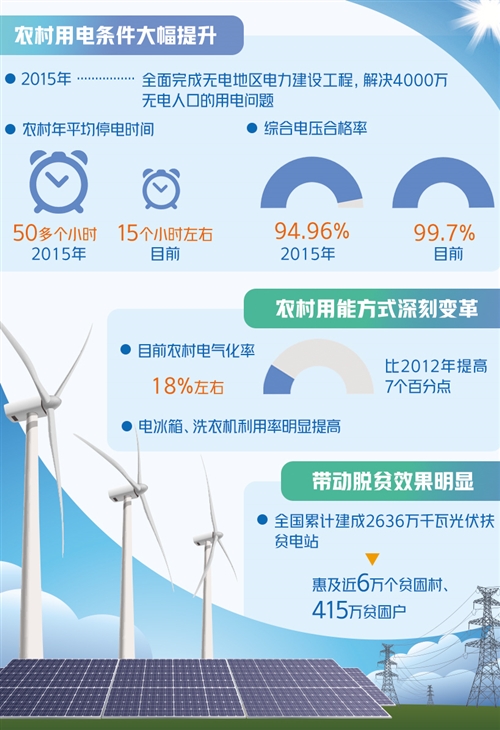 目前,农村年平均停电时间从2015年的50多个小时降低到15个小时左右,综合电压合格率从94.96%提升到99.7%,户均配电容量从1.67千伏安提高到2.7千伏安。