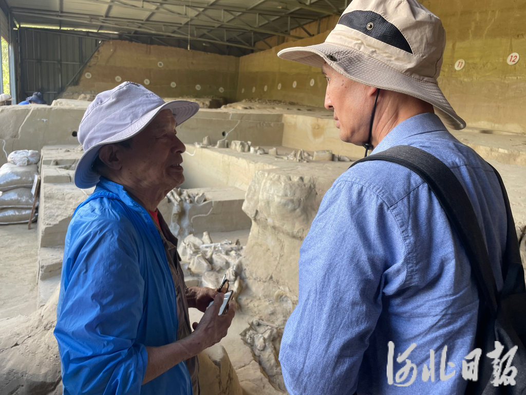 8月21日,参加泥河湾科学发现100周年国际学术研讨会的专家学者来到石沟遗址参观考察。图为两位学者在交流。