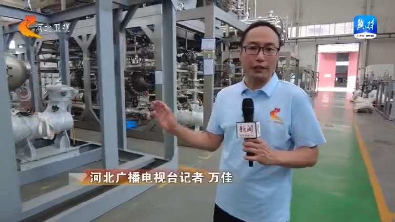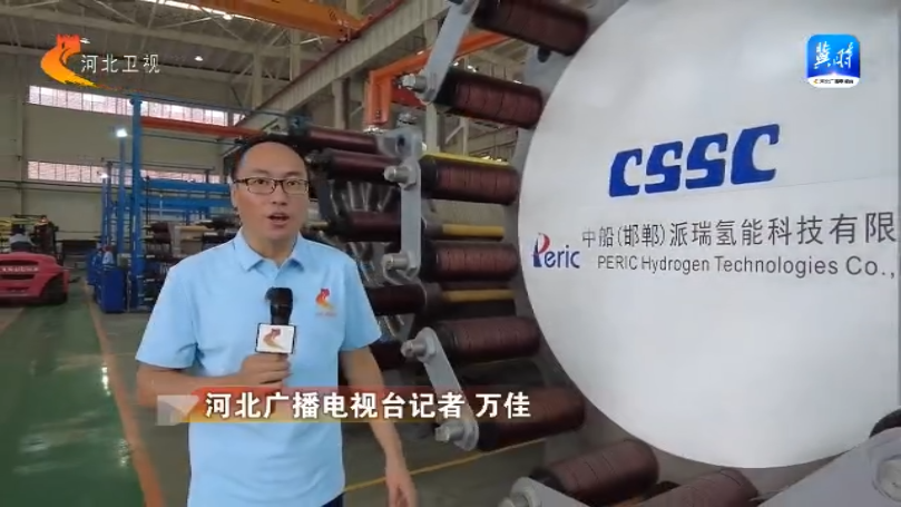 这里是中船(邯郸)派瑞氢能科技有限公司,我身边这个长6米、高近3米的这个圆柱形装置非常的吸睛,它就是刚刚下线的全球最大的碱性制氢装置,它每个小时能产出3000立方米氢气。可以供一辆氢能源电池车从北京开到乌鲁木齐。