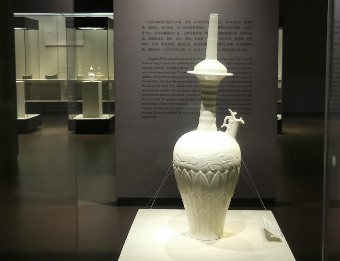 北宋定窑白釉刻花龙首净瓶。