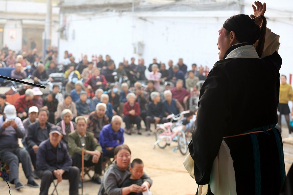 在石家庄晋州市赵兰庄文化广场,赵兰庄丝弦剧团演员表演《铡判官》。(资料片)梁子栋摄