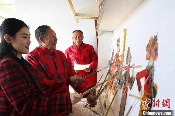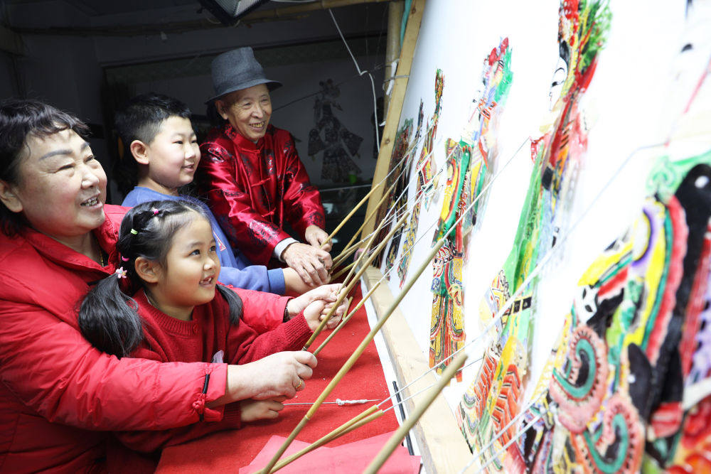 唐山皮影艺人李绍民(中)与孙女、村民一起表演皮影戏。朱大勇摄(图源中新网)