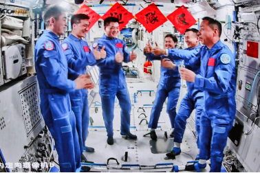 神舟十九号航天员乘组和神舟十八号航天员乘组交流画面。