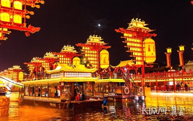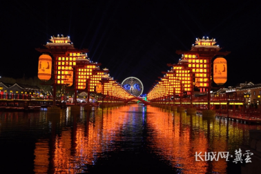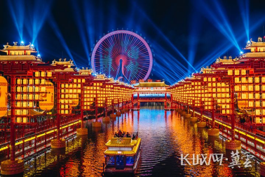 超千米的双层连廊上,唐风灯笼渲染出火红的盛唐景象。连廊下流水潺潺,将人和景倒映在水面。耳畔古乐声声,眼前建筑古香古色,让人仿佛时空穿越、梦回大唐。