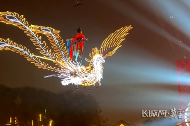 如果说要找出河头老街最具唐风唐韵的代表性的点位的话,凤凰飞天的演出一定不能错过。一只巨大的凤凰展翅飞翔在景区上空,唐装仕女在凤凰背上翩翩起舞。现场观众纷纷拿出手机,记录下这令人震撼的场景。