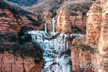 驱车来到石家庄赞皇县嶂石岩景区,与夏日的丹崖碧岭不同,潺潺的山涧流水在低温中凝结成冰凌,在嶂石岩特有的紫红色岩石映衬下,定格成冰瀑奇观,自崖顶垂下,高悬在崖壁之上,最大的一条有30多米,显得蔚为壮观。