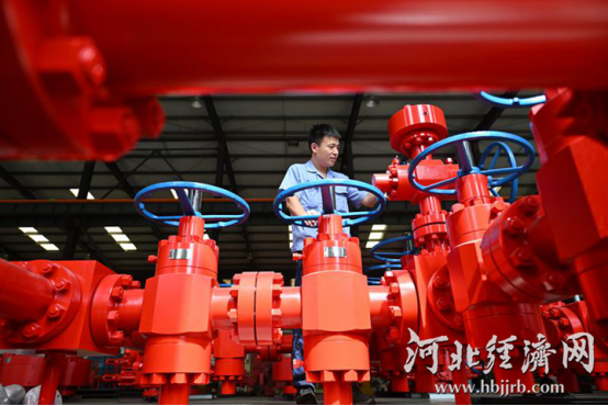 工人在位于任丘市的河北新铁虎石油机械有限公司车间内调试产品。