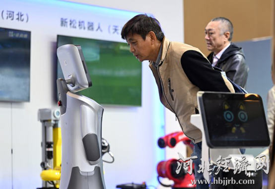 在2024京津冀产业链供应链大会上,与会嘉宾与一款服务机器人互动。