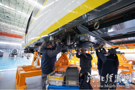在位于保定的京投装备河北京车智能制造基地,工作人员在总组装车间内工作。