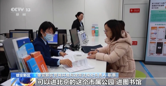 雄安新区营商环境局政策法规处负责人 靳惠:我们要扩展一卡通的应用场景,凭一卡通可以进北京的市属公园、图书馆,在医疗领域我们推进医学资质、医学影像互认。服务领域的扩面,我们将接续发布一些同城化的市场清单。