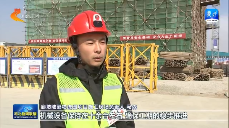 作为我省现代商贸物流重点项目,廊坊陆港物流园建设正在加速推进。在一期项目建设现场,工人们正在进行总部大楼、高标准仓库和货运仓库的施工。为确保施工进度,该项目实行多区域联动施工,主体工程预计6月份完成封顶。