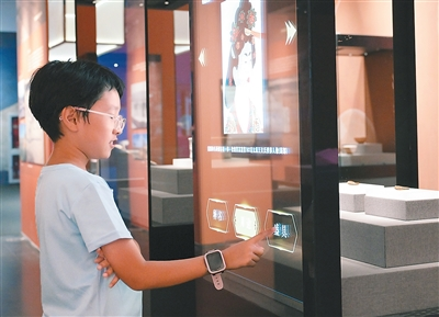 一名小朋友在“长安二千三百里——雄安古州城遗址考古成果展”现场体验文物智能展柜。