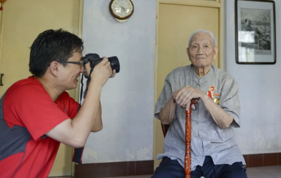 戚辉(左)在为一位八路军老战士拍照。