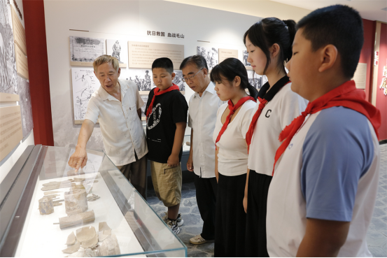 8月3日,在遵化鲁家峪村的鲁家峪陈列馆,志愿者刘超(左一)和李自亚(左三)一起为孩子们讲述当年的抗日故事。