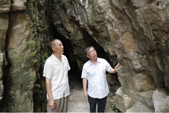 8月3日,在遵化鲁家峪村附近一烈士洞,李自亚(右)向鲁家峪陈列馆志愿者刘超(左)讲述当年母亲救助八路军情况。