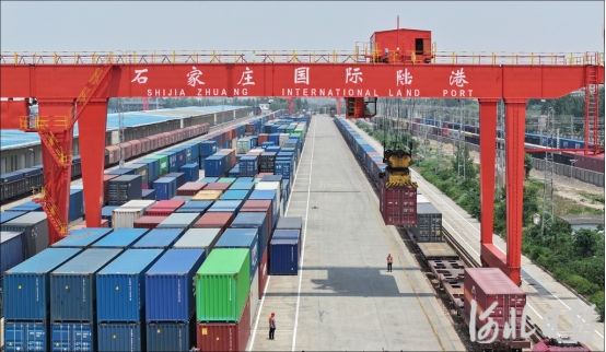 6月11日,石家庄国际陆港内的龙门吊将货物装上列车。