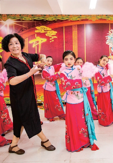 武安市平调落子剧团演员李喜如在指导当地小学生学习戏曲。