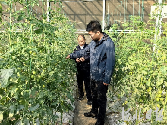 雄安新区都市农业科技博览园技术人员李增辉在大棚里观察番茄植株叶片是否有病害迹象,果实发育是否正常。