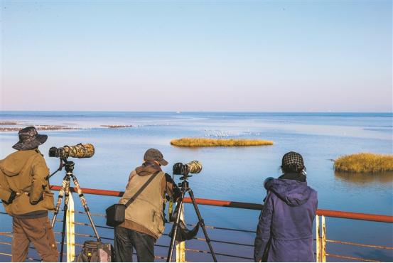 大潮坪木栈道上,观鸟爱好者正在拍摄海鸟。