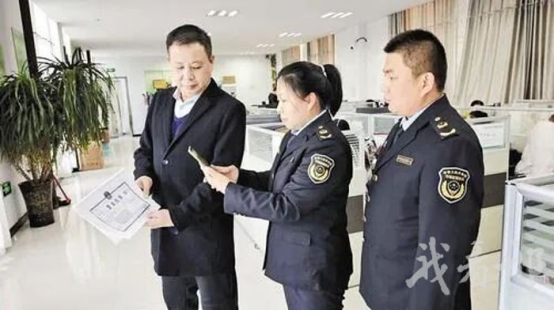 市场监督管理局执法人员对汇康医药有限责任公司进行执法检查前,先进行扫码。