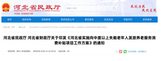记者1月23日从河北省民政厅获悉,自1月起,河北全面实施向中度以上失能老年人发放养老服务消费补贴项目。该项目将通过发放电子消费券,为中度及以上失能老年人购买居家、社区、机构养老服务提供补贴支持。