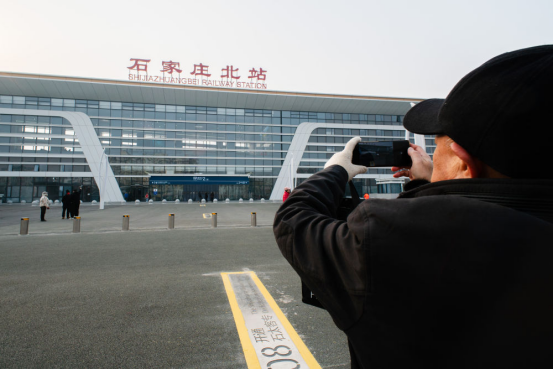 ↑1月26日,市民在石家庄北站外拍照留念。