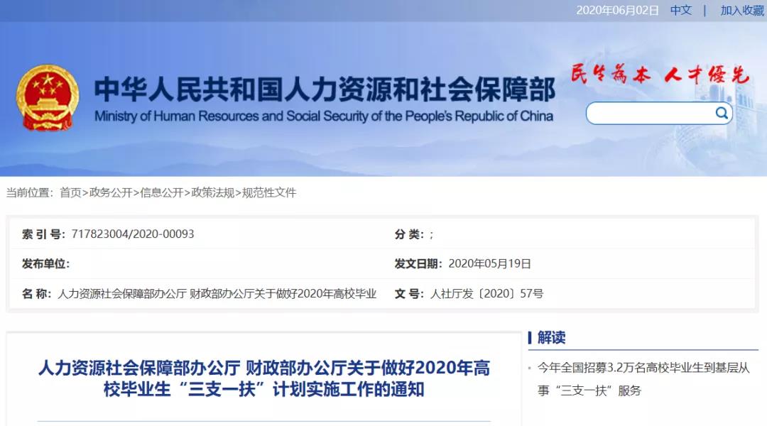 近日,人社部、财政部印发《通知》,部署实施2020年高校毕业生“三支一扶”计划,明确2020年全国招募3.2万名高校毕业生到基层从事支教、支农(水