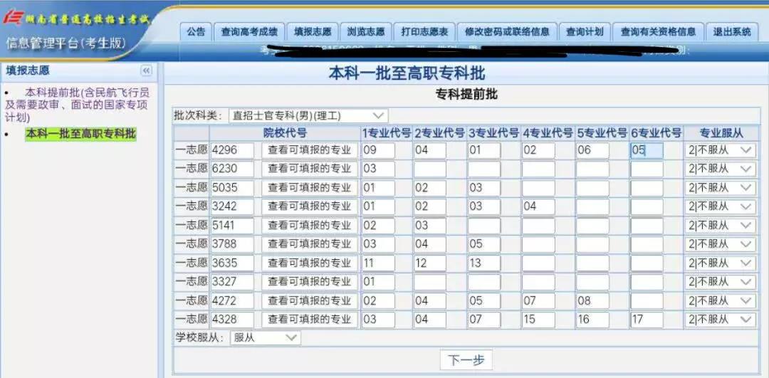 注意:填报定向培养士官院校与填报军校的步骤有所不同,填报定向培养士官院校前不需要提交政治考核表,定向培养士官的政治考核与面试同步进行。定向培养士官志愿填报可以填十个平行志愿,每个学校可以填6个专业,例如: