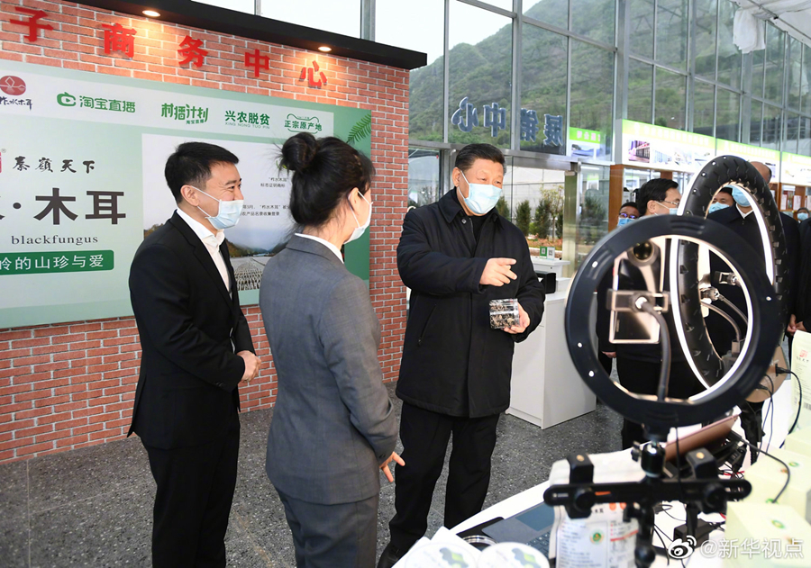 正在陕西考察的习近平总书记20日下午来到柞水县小岭镇金米村。金米村地处秦岭深处,近年来依靠发展木耳等产业摆脱了贫困。村培训中心,几位村民正在做网上直播卖货的准备工作,总书记走到直播平台前,同他们亲切交谈起来。他表示,电商作为新兴业态,既可以推销农副产品、帮助群众脱贫致富,又可以推动乡村振兴,是大有可为的。(文字记者:张晓松 摄影记者:鞠鹏、谢环驰、燕雁、翟健岚)
