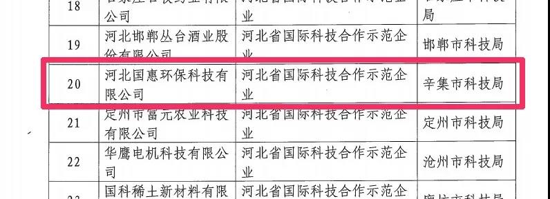 导读:7月9日,河北省科学技术厅印发《关于认定2020年度河北省国际科技合作基地的通知》(冀科外函【2020】31号,我市河北国惠环保科技有限公司上榜,这是辛集市首个省级国际科技合作基地。