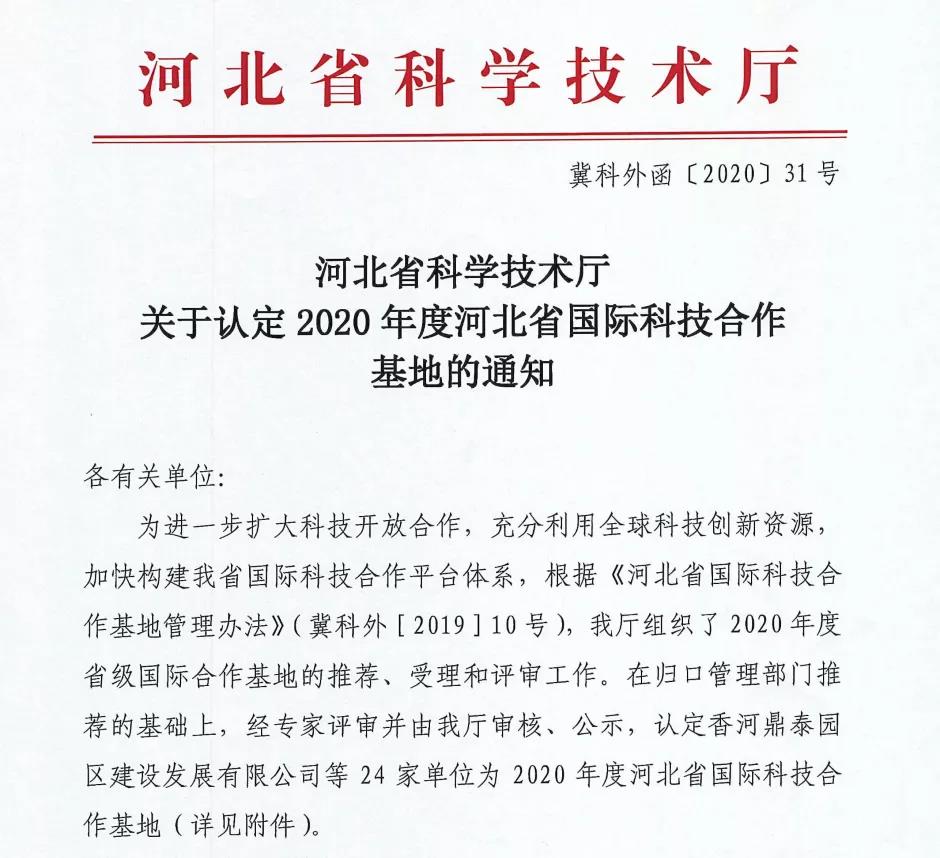 7月9日,河北省科学技术厅印发《关于认定2020年度河北省国际科技合作基地的通知》(冀科外函【2020】31号),认定24家单位为2020年度河北省国际科技合作基地。